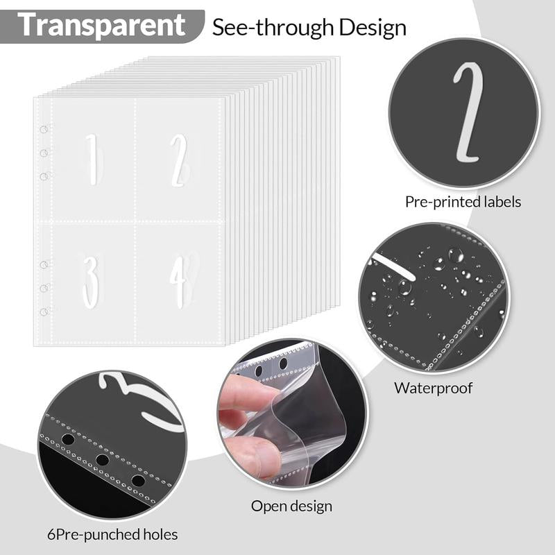 • EASY TO CARRY AND USE:The cash binder is the right size for you to take it anywhere. The transparent inner volume consists of 25 pages. There are 4 card slots on theof each page, a total of 100 card slots. A rich combination of accessories allows you to complete records anytime, anywhere. This is a great budget binder.